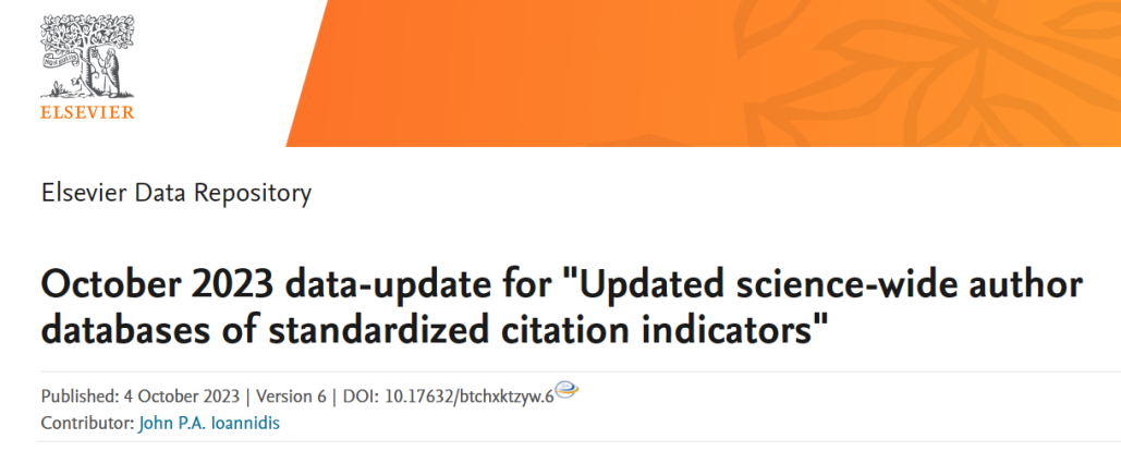 近日,斯坦福大学John P. A. Ioannidis教授团队更新了其发布的全球前2%顶尖科学家榜单,并在Elsevier旗下Mendeley Data发布(October 2023 data-update for“Updated science-wide author databases of standardized citation indicators”)。该榜单基于Scopus数据库,依照科技工作者科研产出、Google Scholar Metrics期刊评分、H指数、成果被引、成果中作者排序位置等参数进行综合评估,遴选出排名前2%的科学家,分为22个领域和174个细分子领域,旨在提供一个科学家长期科研表现的衡量指标,更客观、更真实地反映科学家的影响力。