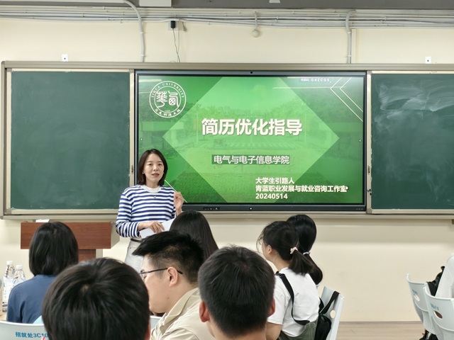 为了更好的帮助大三学生做好求职准备,打造脱颖而出的简历,提升求职竞争力。5月14日下午,电气与电子信息学院“大学生引路人”—青蓝职业发展与就业咨询工作室在3C-101开展了一场别开生面的简历优化指导活动。