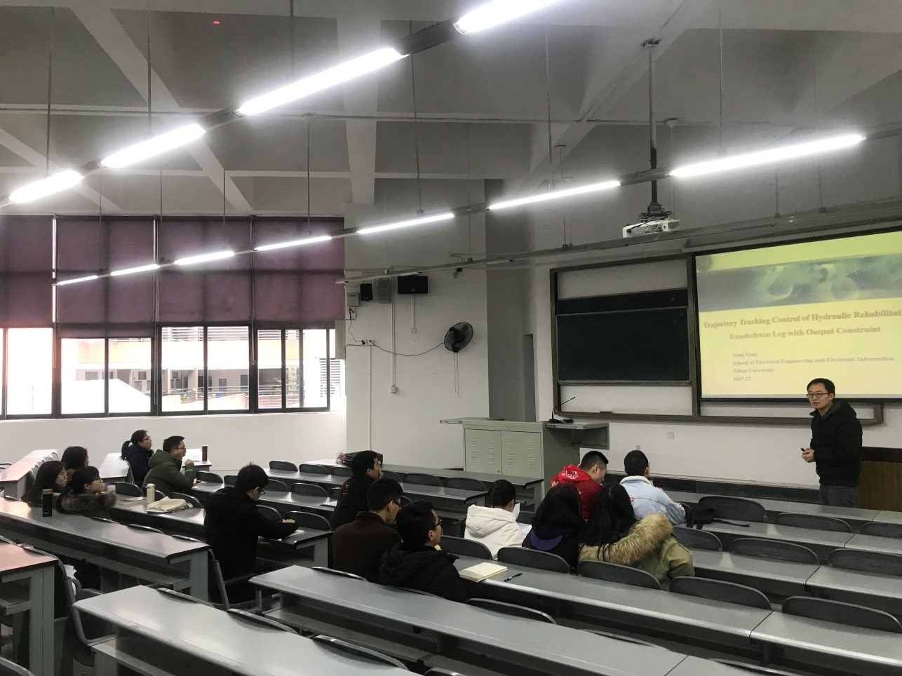 20191226日上午10:00,电气与电子信息学院研学论坛于6B304开展了学术交流讲座。杨勇博士做了一场题为Trajectory Tracking Control of Hydraulic Rehabilitation Exoskeleton Leg with Output Constraint的学术报告,电气与电子信息学院师生到场参加。