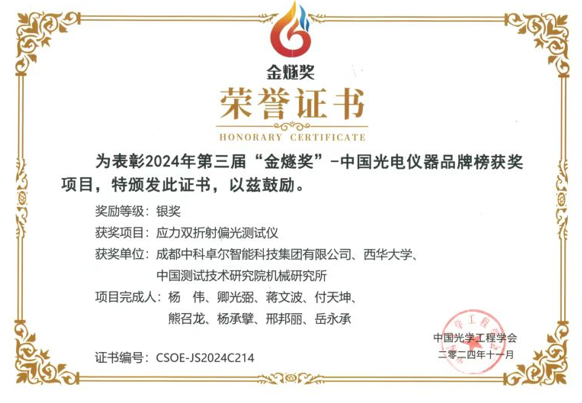 近日,电气与电子信息学院蒋文波教授为主要完成人,联合成都中科卓尔智能科技集团有限公司、中国测试技术研究院机械研究所共同研制的“应力双折射偏光测试仪”荣获2024年度第三届“金燧奖”中国光电仪器品牌榜银奖。