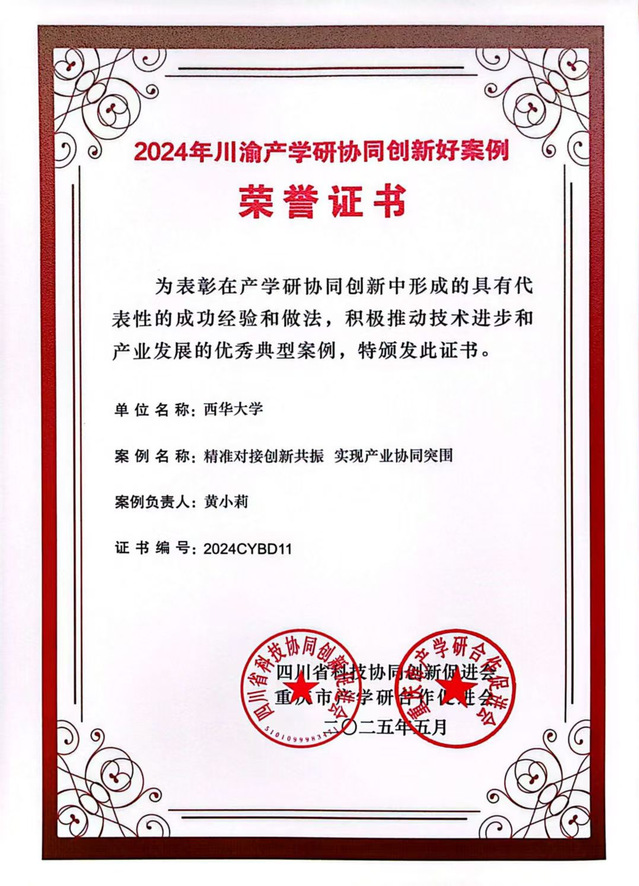 四川省科技协同创新促进会与重庆市产学研合作促进会联合发布认定结果,经严格评审,全省仅 5 个项目入选十大案例,西华大学成为少数获此荣誉的地方高校。5 19 日,该成果在第五届重庆四川技术转移转化大会上作为川渝协同创新典型案例重点展示,其 “高校技术供给 + 企业场景验证 + 区域产业赋能” 的模式,获川渝两地政府部门、行业专家及企业代表的高度关注。