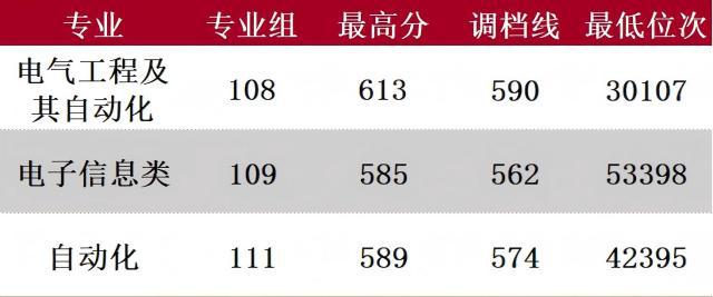 在本次录取中,电气工程及其自动化专业(专业组108)最高分达613分,调档线为590分,最低位次30107;电子信息类专业(专业组109)最高分585分,调档线562分,最低位次53398;自动化专业(专业组111)最高分589分,调档线574分,最低位次42395。