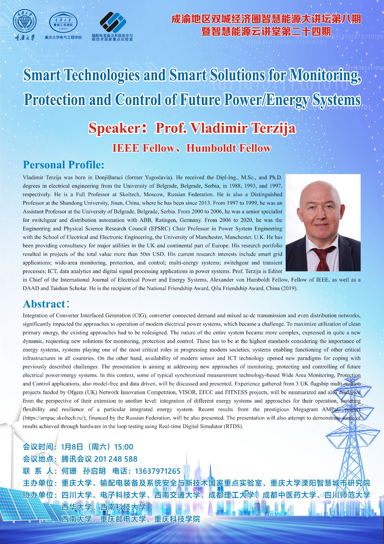 报告主题:Smart Technologies and Smart Solutions for Monitoring, Protection and Control of Future Power/Energy Systems.