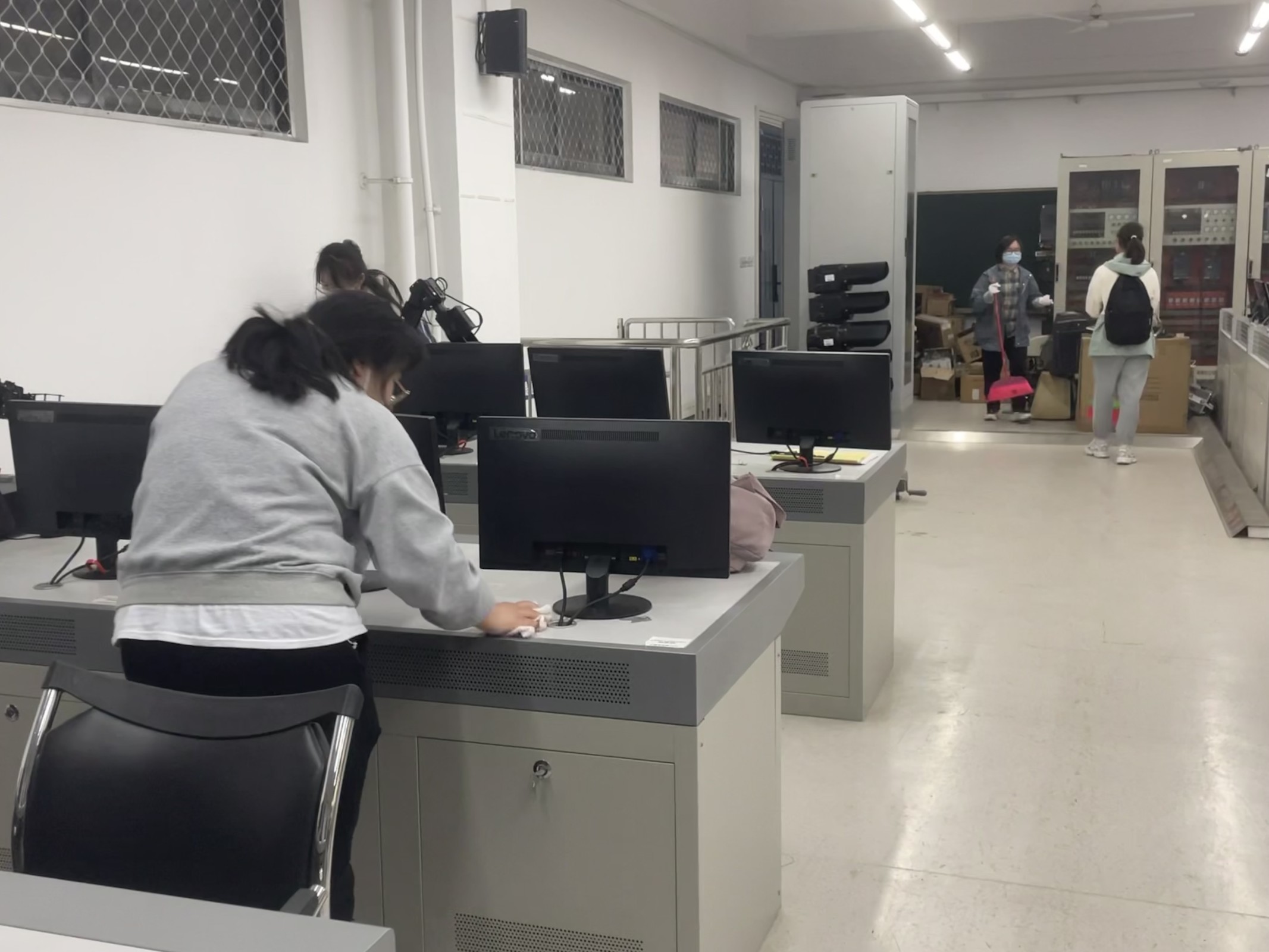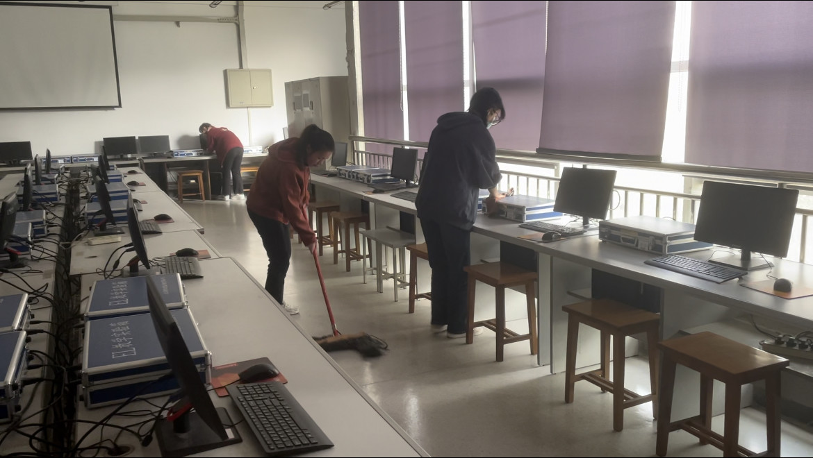 当日下午,志愿者在电气学院实验室教师余建华的带领下分为多个小组,进入不同实验室进行卫生清理活动,包括抹、扫、拖和归置等细致工作。志愿者在服务过程中都抱着极高的劳动热情和一丝不苟的态度。
