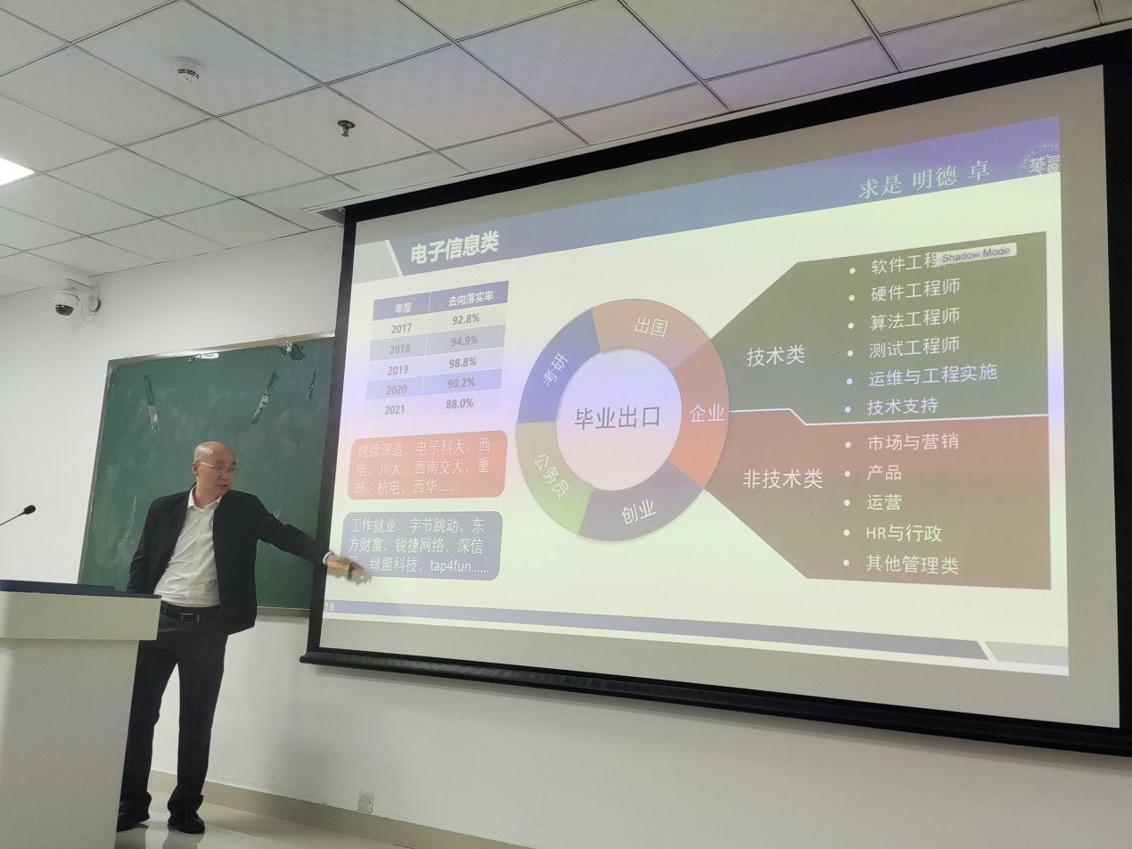 517日,电气与电子信息学院卿朝进教授在宜宾校区一教201为信息工程学生考研交流分享。电气学院党委副书记郭忠林和辅导员邓艳梅到场参加。
