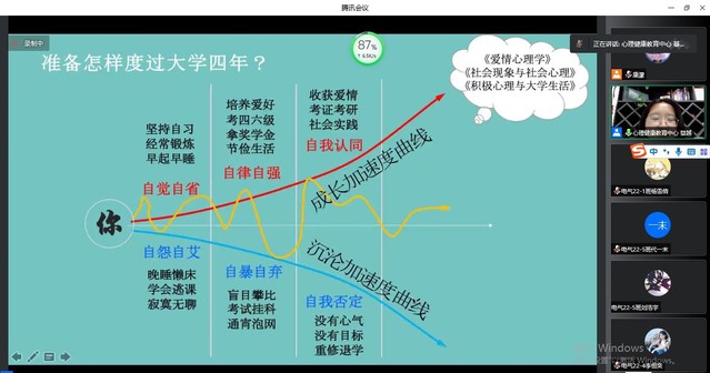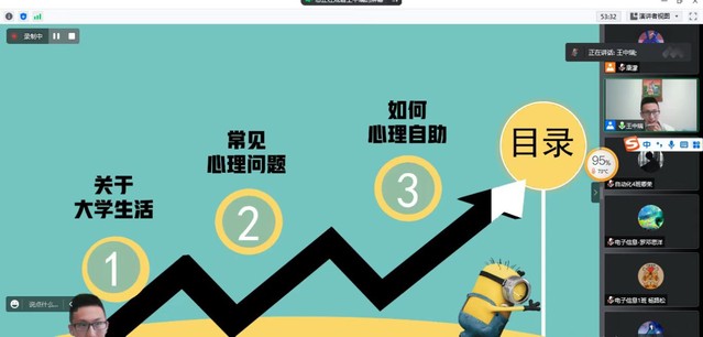 王中瑞列出了常见心理问题,并从心理自助的途径、面对问题如何调节心情和应对问题和压力等展开论述。张又文讲解了大学新生主要心理任务的变化,包括对环境变化的适应、学业自控力、压力管理和心理素质成长等。