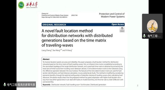 程亮同学进行了题为“A novel fault location method for distribution networks with distributed generations based on the time matrix of traveling-waves”的精彩报告,程亮同学在研究中提出了一种基于时间判定矩阵的配电网波故障定位方法,可以实现配电网故障区判定与故障点位置的精确计算;在对固有参数建立时间判定矩阵时,可通过归一化的架空线行波波速进行构建和计算;此外通过设定误差修订系数,判定有效区故障和非有效分支故障时特征会更明显。
