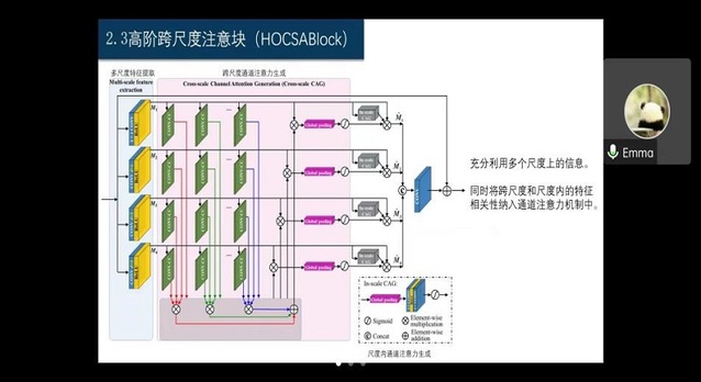 罗松宁同学进行了题为“High-Order Cross-Scale Attention Network for Single Image Super-Resolution”的精彩报告,罗松宁同学从双嵌套残差块、高阶跨尺度注意块以及BI退化模型视觉结果比较等内容介绍了研究内容。