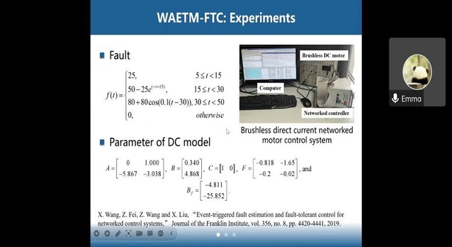 周小煜同学进行了题为“event-triggered fault-tolerant control for nonlinear networked control systems”的精彩报告,周小煜同学对其研究方法、网络控制系统以及进行实验时的相关内容进行了分享。