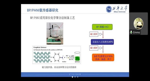 梁雷同学进行了题为“High sensitivity of ammonia sensor through 2D black phosphorus/polyaniline nanocomposite”的精彩报告,梁雷同学具体分析了气体传感器的研究背景和现状,之后对BP/PANI氨传感器的制备工艺、表征测试、气敏特性等研究内容进行了介绍。