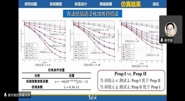 唐书海同学在线上进行了题为“Lightweight 1-D CNN-Based Timing Synchronization for OFDM Systems With CIR Uncertainty/Label Design-based ELM Network for Timing Synchronization in OFDM Systems with Nonlinear Distortion”的精彩报告,唐书海同学介绍了正交频分复用系统、发射机有非线性失真、传统定时预处理进行模式驱动以及神经网络采用极限学习机的系统模型内容,之后对标签设计、网络部署以及仿真结果进行了讲解。
