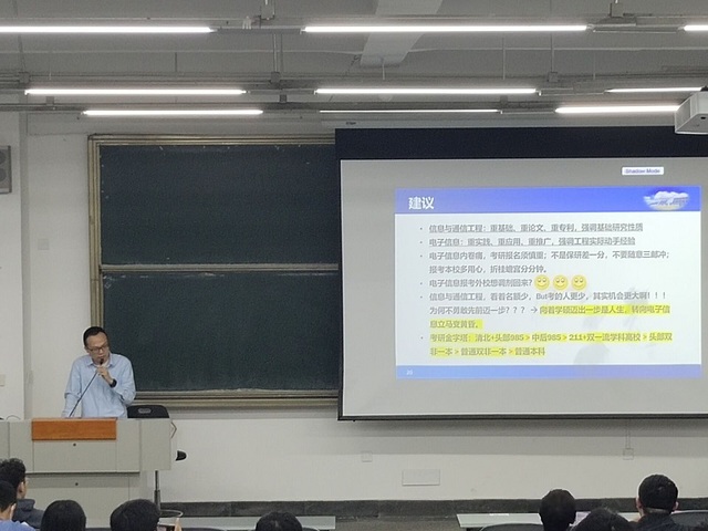 4月13日中午,电气与电子信息学院在6B208举办2019级电子信息类就业和考研指导讲座。信息工程系主任郭奕老师主讲,2019级电子信息类全体同学到场参与。