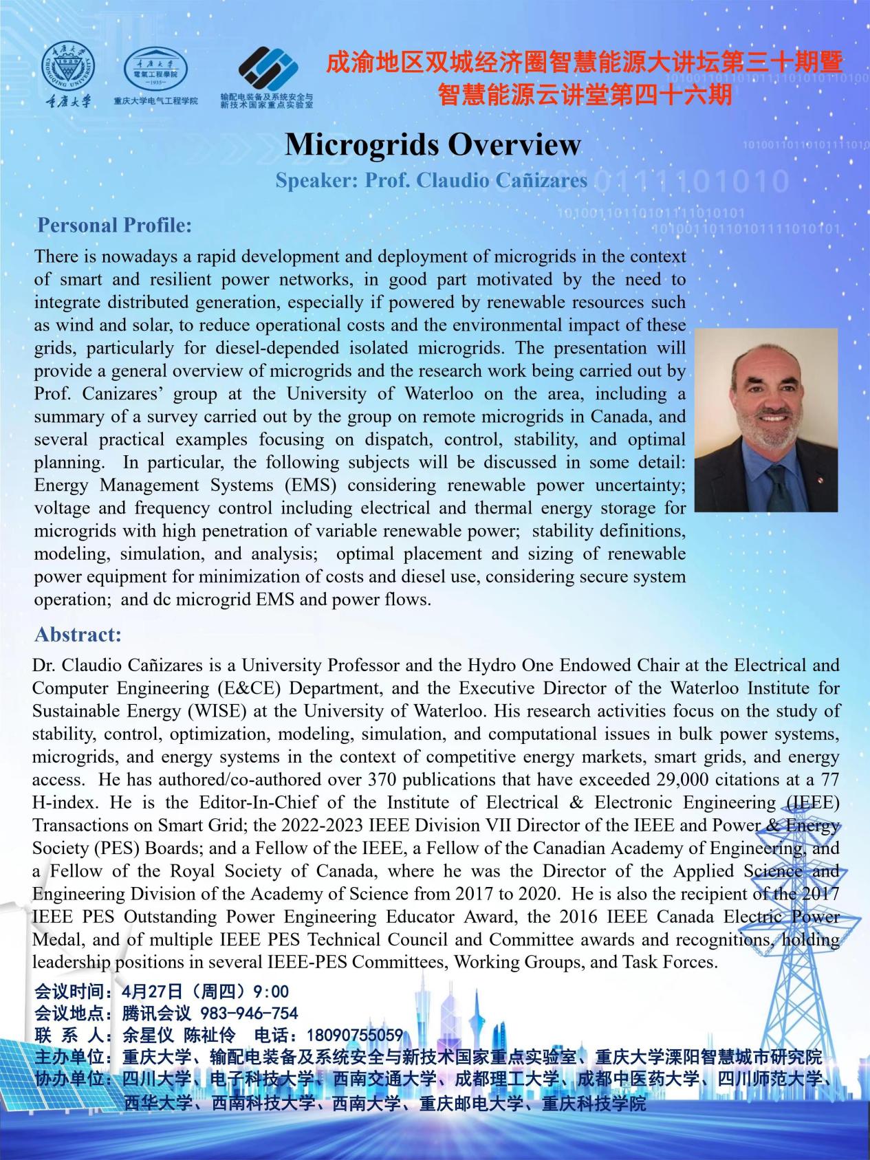 There is nowadays a rapid development and deployment of microgrids in the contextof smart and resilient power networks, in good part motivated by the need tointegrate distributed generation, especially if powered by renewable resources suchas wind and solar, to reduce operational costs and the environmental impact of thesegrids, particularly for diesel-depended isolated microgrids. The presentation willprovide a general overview of microgrids and the research work being carried out byProf. Canizares’ group at the University of Waterloo on the area, including asummary of a survey carried out by the group on remote microgrids in Canada, andseveral practical examples focusing on dispatch, control, stability, and optimalplanning. In particular, the following subjects will be discussed in some detail: Energy Management Systems (EMS) considering renewable power uncertainty; voltage and frequency control including electrical and thermal energy storage formicrogrids with high penetration of variable renewable power; stability definitions.modeling, simulation, and analysis; optimal placement and sizing of renewablepower equipment for minimization of costs and diesel use, considering secure systemoperation; and dc microgrid EMS and power flows.