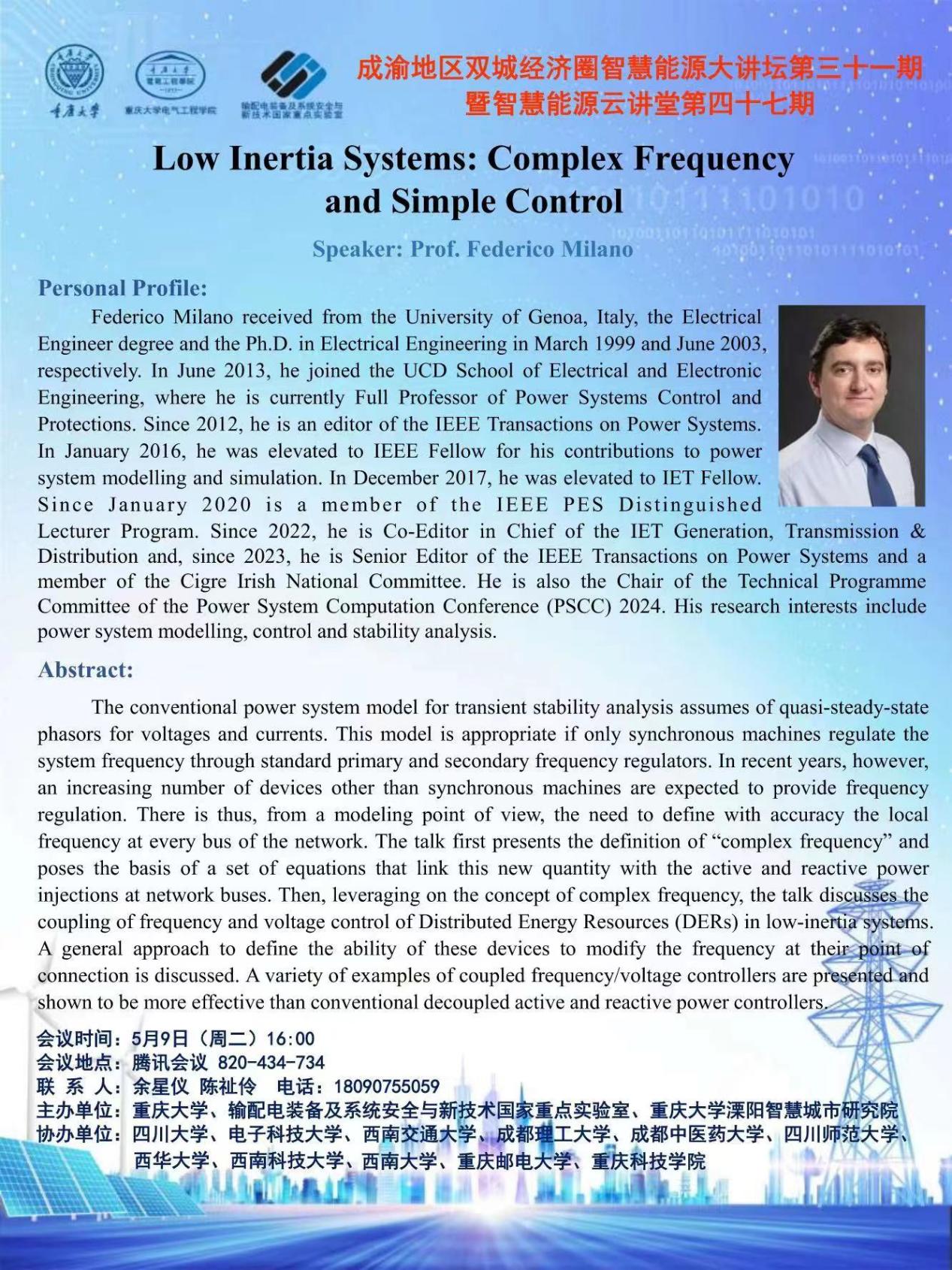 电气与电子信息学院学术报告——Low Inertia Systems: Complex Frequency and Simple Control